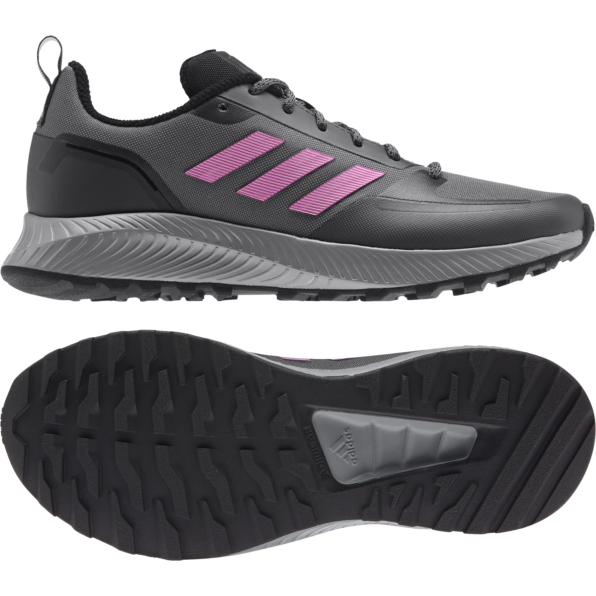 - Adidas Runfalcon välistald on valmistatud ühes tükis kummimaterjalist. Selliselt kindlustab välistald hea haarduvuse erisugustel sillutatud pindadel, kaitstes samal ajal välistalda kulumise eest. Kummimaterjal pakub ka paindlikkust ja täiendavat tuge jalatallale.