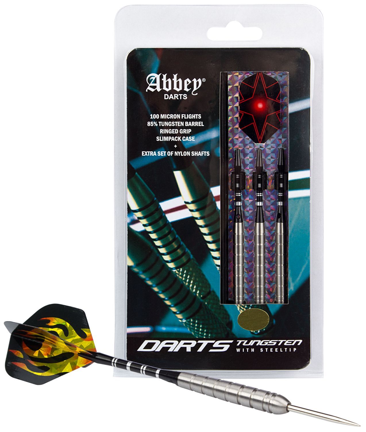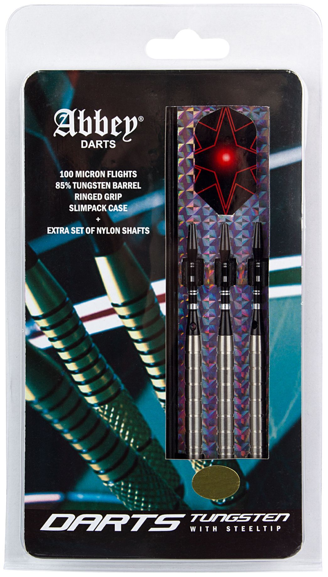Noolemängu nooled, 85% volframist, alumiiniumist vars, terasest ots, 26 grammi, sobivad kasutamiseks tavalistel noolemängu laudadel. Pakendis kolm noolt, lehvikut, vart, otsa ning noolekarp.