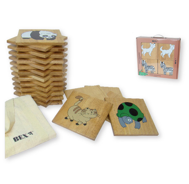 Komplekti kuulub: 14 paarist erinevate loomadega klotsist, 1 kott