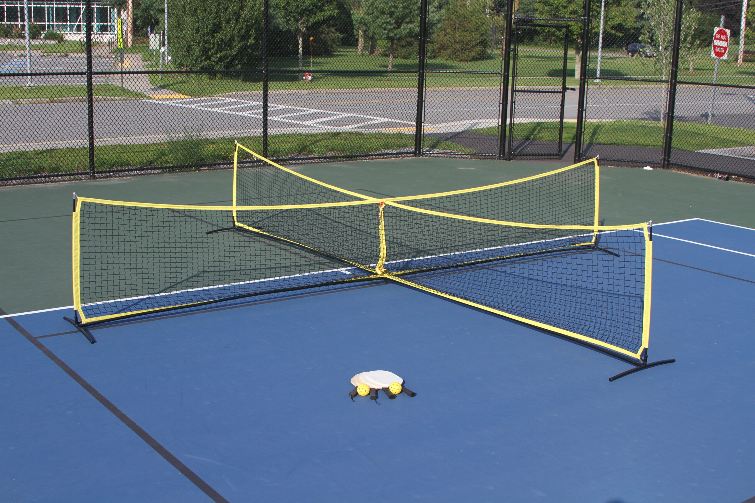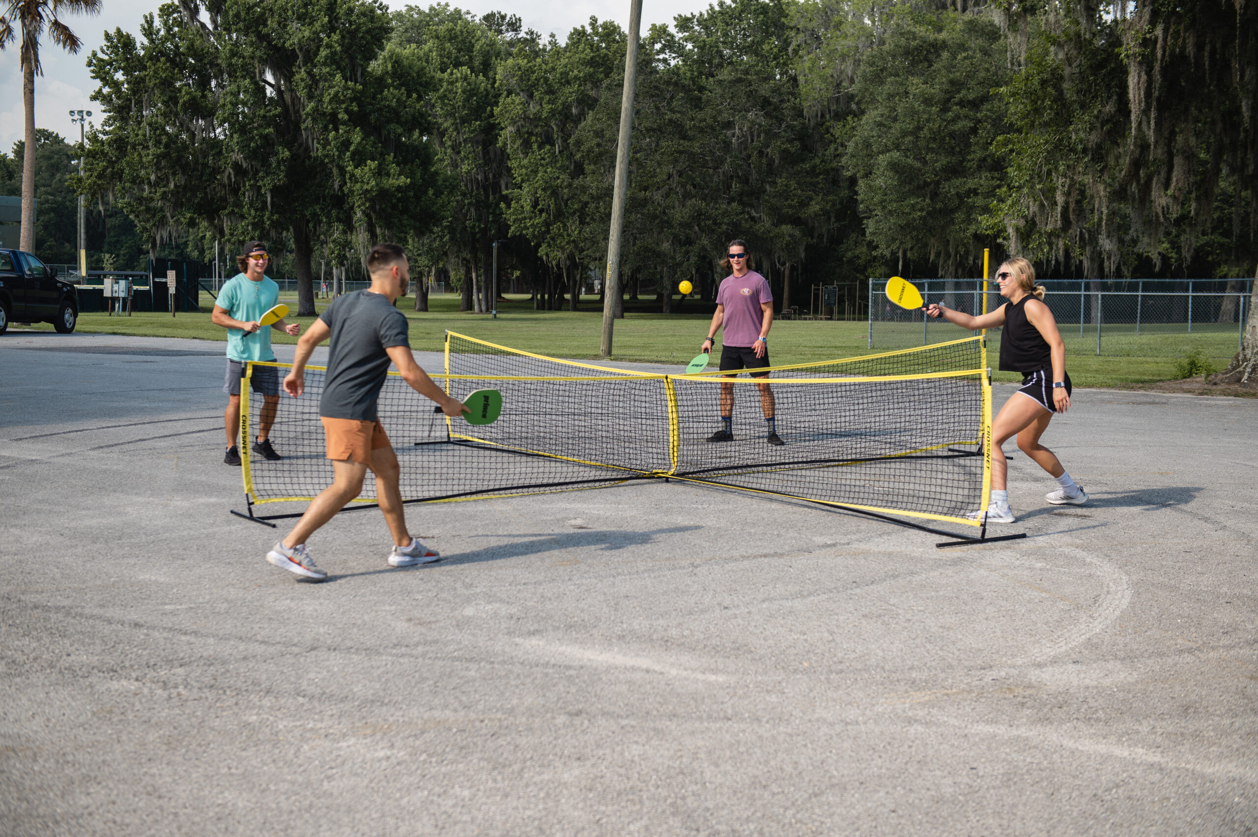 Maailma esimene 4-võrguga Pickleballi mäng! CROSSNET Pickleball on ainulaadne ja lõbus versioon klassikalisest Pickleballi mängust, mida saab mängida kaks kuni neli mängijat. Sellel on maailma kõige mitmekülgsem võrk, mida saab lihtsalt mõne sekundiga muuta standardsuuruses Pickleballi võrgust (22′ x 22′) 4-suunaliseks võrguks. Komplekt sisaldab kõike, mida mängimiseks vajate: reketid, kaks perforeeritud palli ja kandekott.
