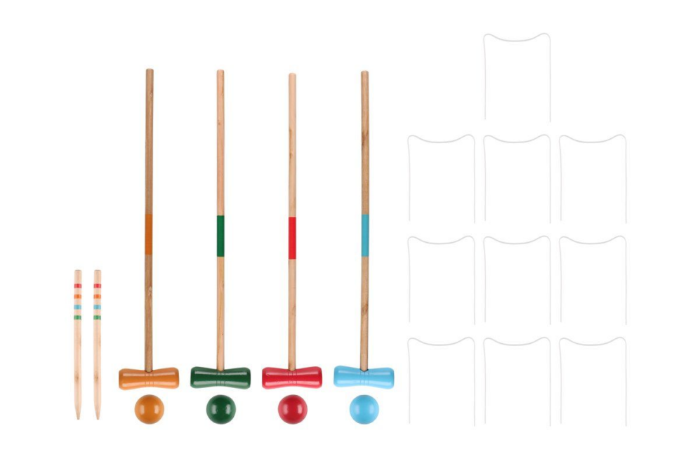 Komplekti kuulub: 4 mängukeppi, 4 palli, 2 sihtmärgi pulka, 6 väravat, 1 kott.