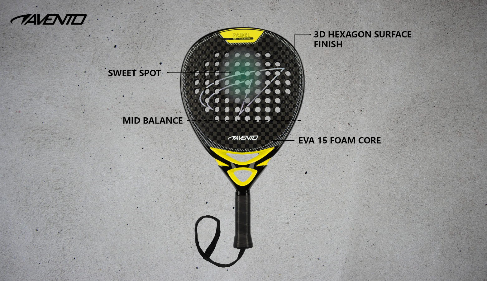 Paragon padelreketil on tilgakujuline 12K põimitud süsinikraam. See kombinatsioon tagab täiusliku tasakaalu jõu ja kontrolli vahel. Lisaks on sellel reketil topeltsild, et reket neelab väga hästi vibratsiooni ning igas tabamuses on rohkem jõudu ja stabiilsust. Reketi pea on 38 mm paksune ja reketi südamik on valmistatud kvaliteetsest EVA 15 vahust. Reketi pealispinnal on 3D kuusnurkne viimistlus, mis tagab palli täiusliku haarde. Ideaalne põrkepalli löömiseks. Lisaks tagab see reljeef, et Paragoni pind on kare ja seetõttu vähem kulumistundlik. Selle reketi ideaalne löögipunkt, mida nimetatakse ka "magusaks kohaks", asub veidi üle keskmise. See annab teile rohkem jõudu ja 12K süsinik annab teile optimaalse juhitavuse. Tugev 12K süsiniku materjal on eriti vastupidav, nii et see reket võib kesta aastaid. Selle mudeli "keskmine tasakaal" muudab reketi käsitsemise lihtsamaks ja tagab sujuva löögi. See tähendab, et raskus jaotub ühtlaselt käepideme ja reketi ülaosa vahel. Selle mudeli "keskmine tasakaal" muudab reketi manööverdatavaks. See tähendab, et raskus jaotub ühtlaselt käepideme ja reketi ülaosa vahel. "Keskmise tasakaaluga" reket annab väiksema takistuse kui "kõrge tasakaaluga" reket, kuid on jäigem kui "madala tasakaaluga" reket, nagu Avento Conquista. Seetõttu sobib reket edasijõudnutele või võistlejatele. Sellel vastupidaval reketil on teibitud käepide ja see on varustatud randmerihmaga, millega sa kannad reketit mängimise ajal.
