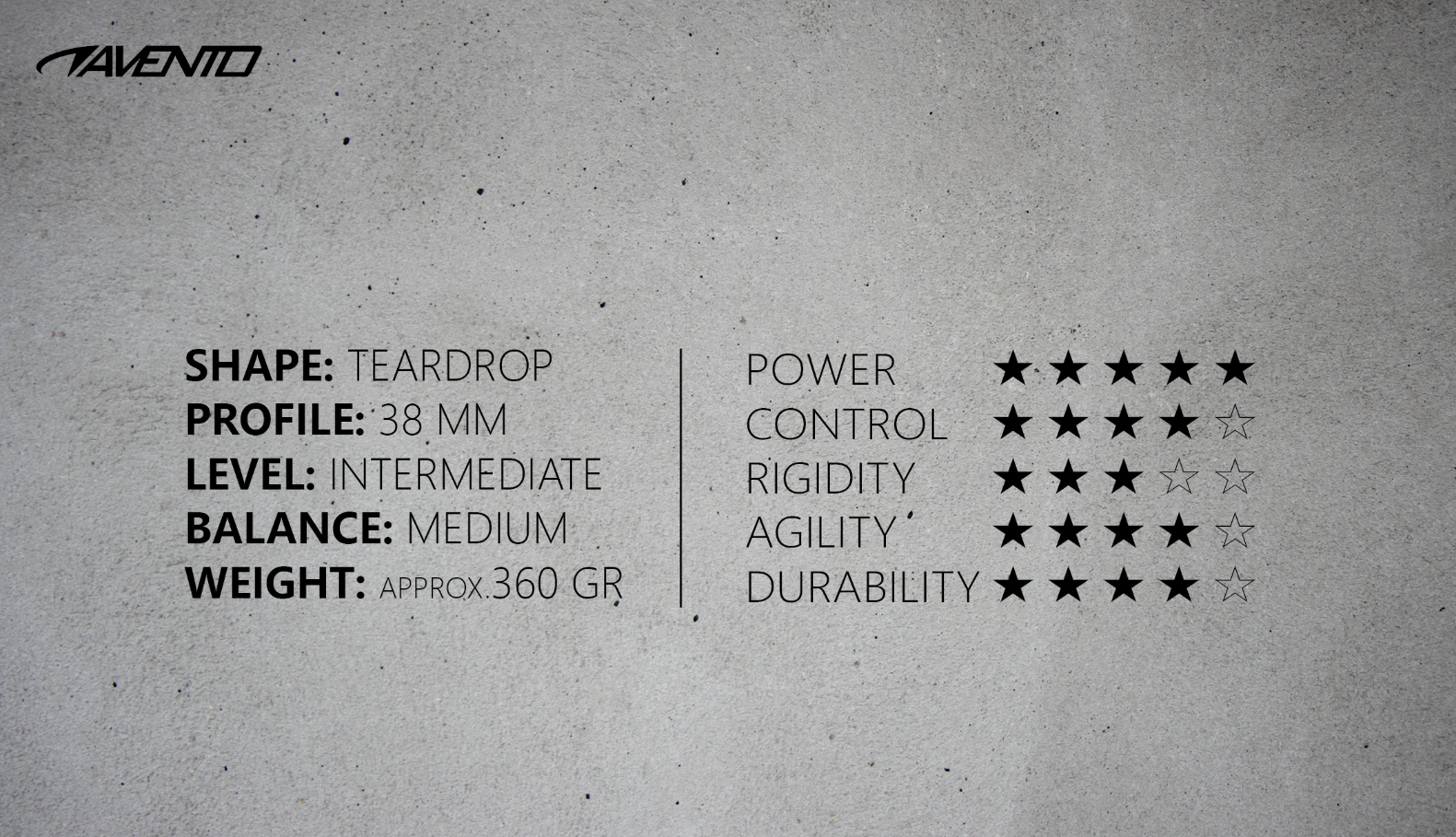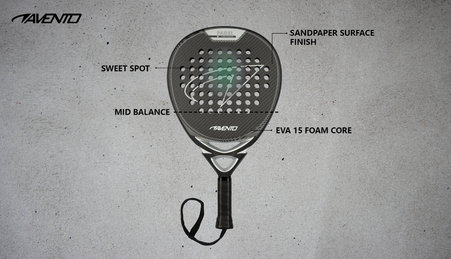 Kasutage maksimaalset võimsust: Vencedori padelreketil on pisarakuju ja 3K süsiniku raam. Lisaks on sellel reketil topeltsild, et reket neelab hästi vibratsiooni ja oleks pallilöömisel rohkem stabiilsust. Reketi pea on 38 mm paksune ja südamik on valmistatud kvaliteetsest EVA 15 vahust. Reketi pealispinnal on matt liivapaberiga viimistlus, mis annab pallile eriti hea haarde. Ideaalne näiteks põrkepalli löömiseks. Selle reketi ideaalne löögipunkt, mida nimetatakse ka "magusaks kohaks", asub veidi üle keskmise. See annab teile rohkem jõudu ja selle reketi 3K süsinikmaterjal hoiab teid kontrolli all. Selle mudeli "keskmine tasakaal" muudab reketi manööverdatavaks. See tähendab, et raskus jaotub ühtlaselt käepideme ja reketi ülaosa vahel. Vencedori reket annab seega teile maksimaalse võimsuse ja võimsa vibra, samal ajal säilitades manööverdusvõime ja juhitavuse nagu tšempion. Avento Vencedor reket on varustatud nutika 'augusüsteemiga', mis vähendab takistust ja suurendab kiirust.