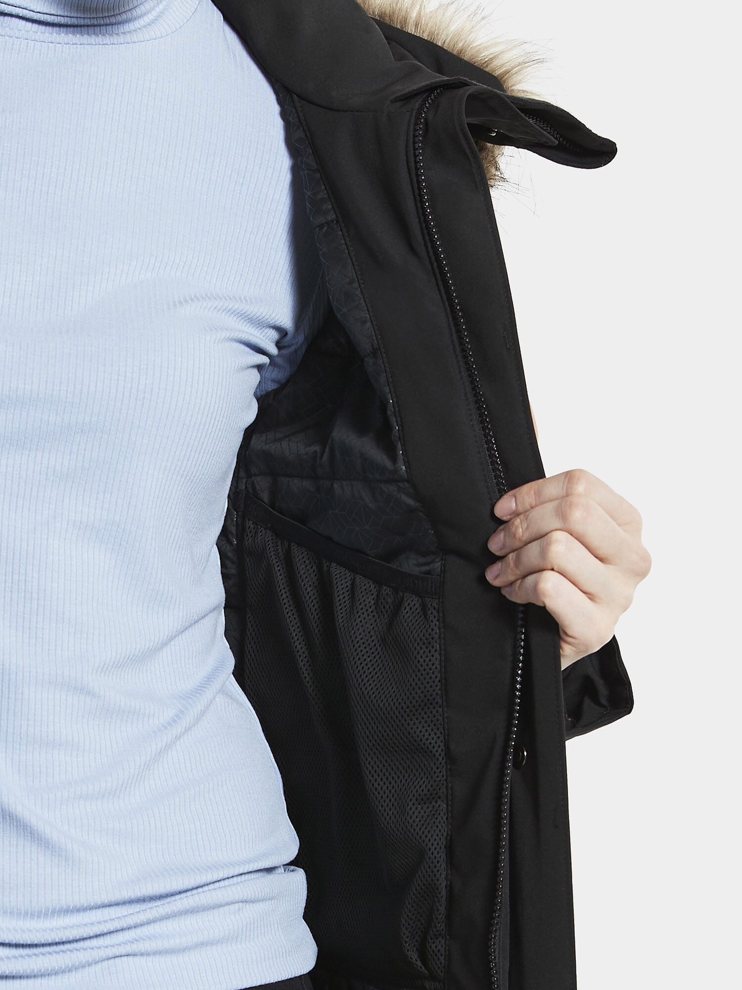 • Reguleeritav fikseeritud kapuuts eemaldatava kunstkarvaga