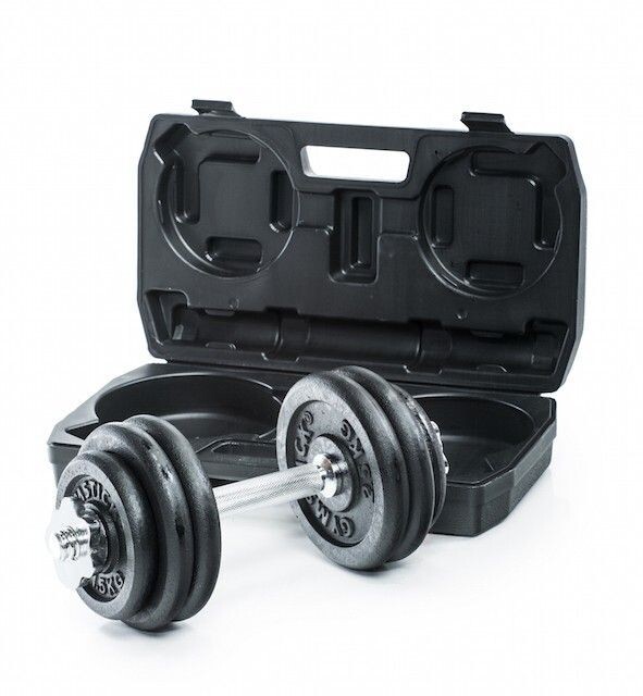 Gymsticki reguleeritav hantel kogukaaluga 15 kg. Komplektis: 2X1.25 kg, 4X2.5 kg raskuskettad ning hantlikang diameetriga 28 mm, kangi pikkus 350 mm, kaks mutterlukku ning mugav plastikust hoiustamiskarp.