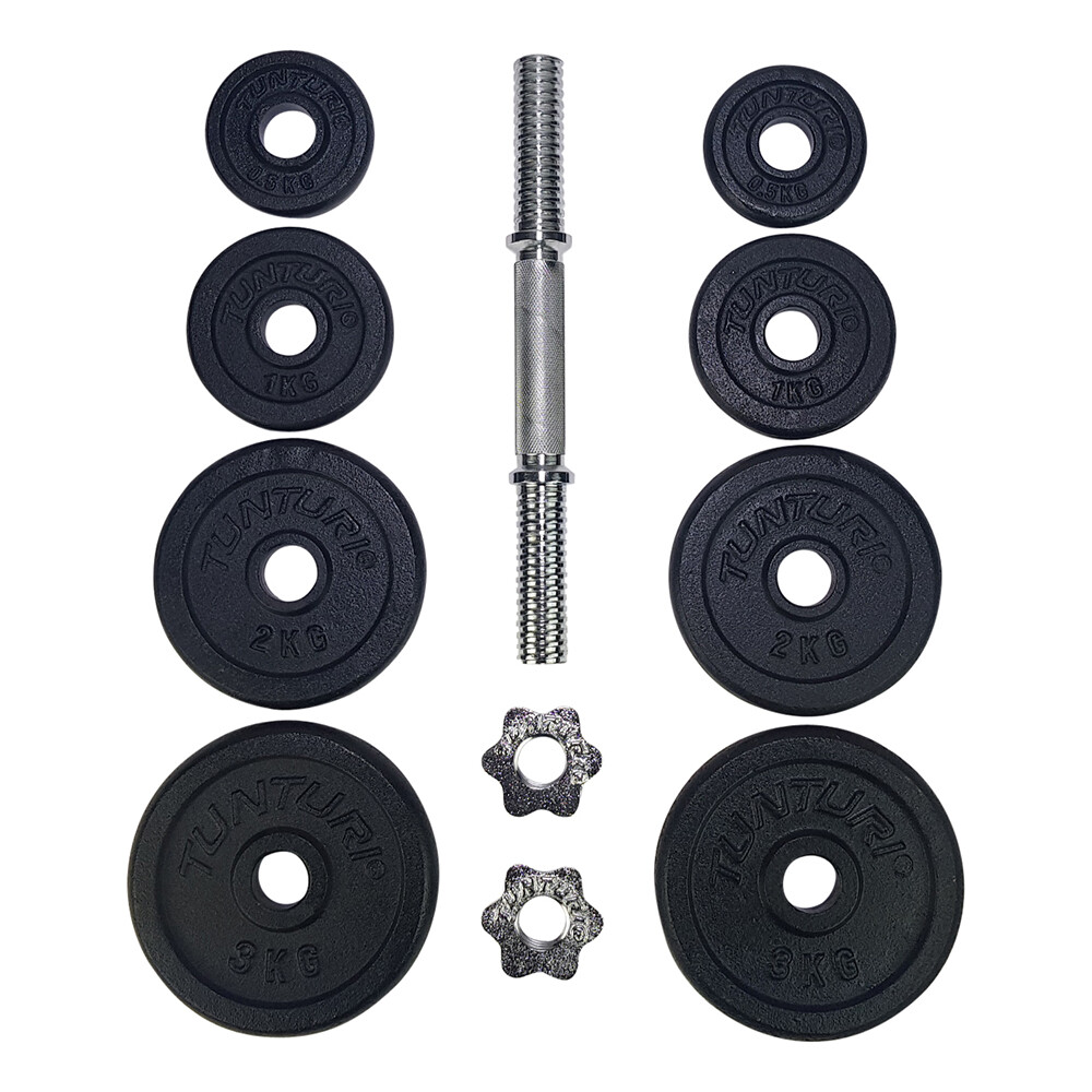 Tunturi reguleeritav hantel kogukaaluga 15 kg. Komplektis: 2X3 kg, 2X2 kg 2X1 kg, 2X0.5 kg raskuskettad ning hantlikang diameetriga 28 mm, kangi pikkus 350 mm, kaks mutterlukku.