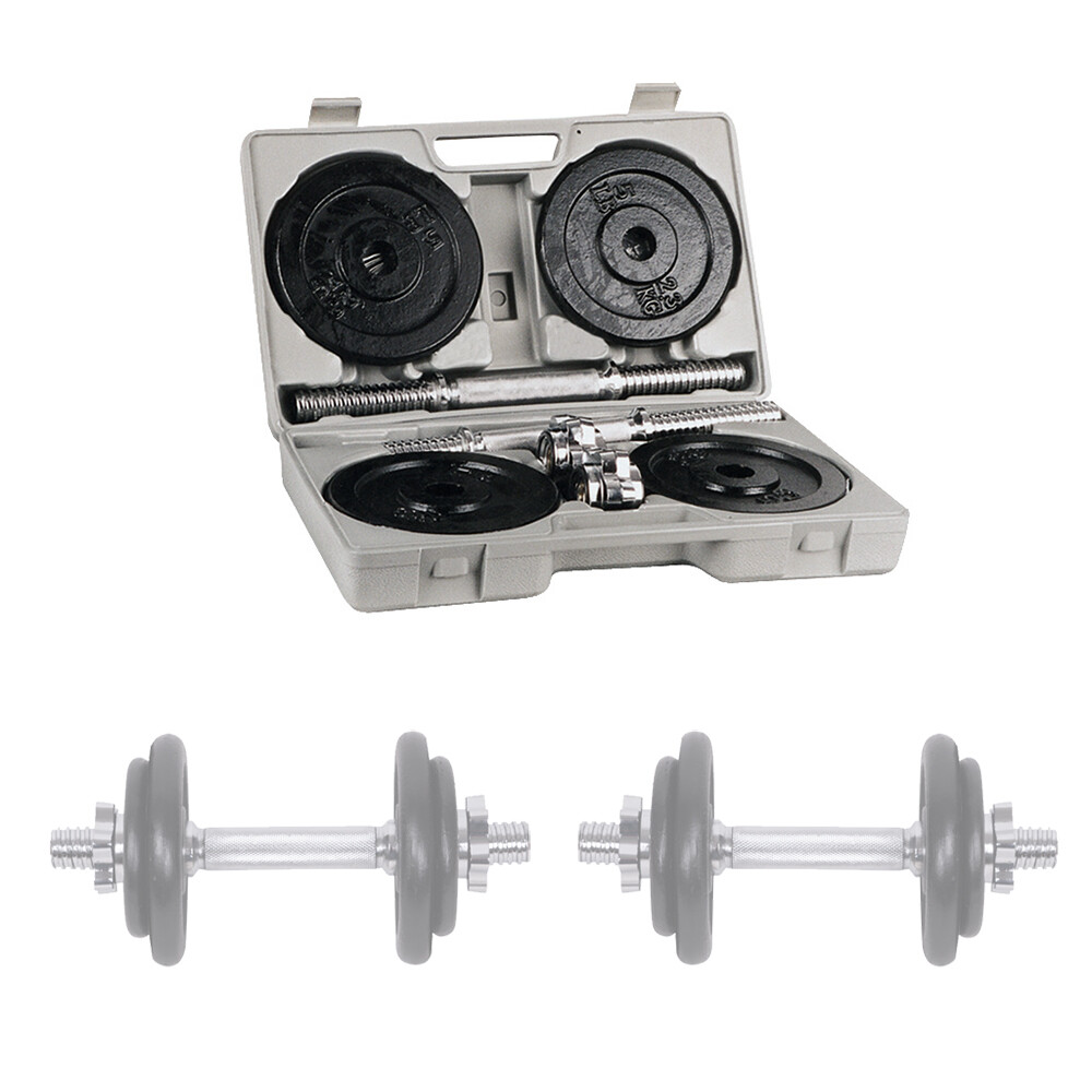 Praktiline hoiustamine: Komplektiga kaasas olev vastupidav plastikkohver võimaldab hantleid ja raskusplaate mugavalt hoiustada ja transportida, hoides need organiseeritult ja kaitstult.