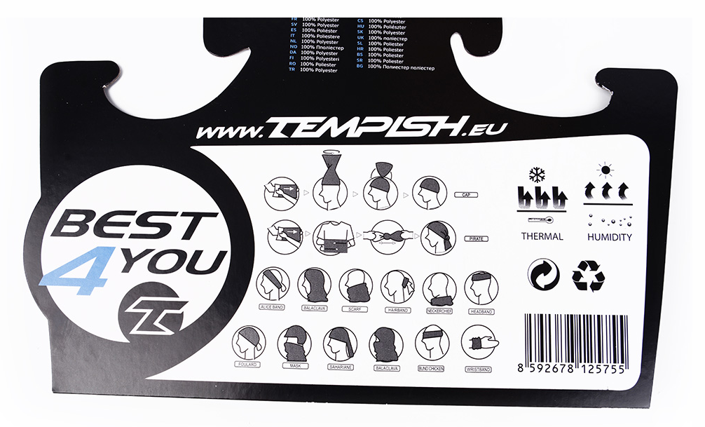 Originaalse kujundusega multifunktsionaalne buff. Seda on mõnus ja pehme kanda ning sellel on tõeliselt lai kasutusala. See kaitseb teie pead, kaela, nägu või käsi. Buffi saab kasutada jalgrattasõiduks, välispordiks, matkamiseks, kaitseks päikese, külma, tolmu eest, kuid seda saab kasutada ka töötamisel, juuste sidumisel. Tänu oma universaalsele suurusele ja materjali elastsusele sobib see nii täiskasvanutele kui ka lastele. Kergesti pestav. Materjal: 100% polüester.