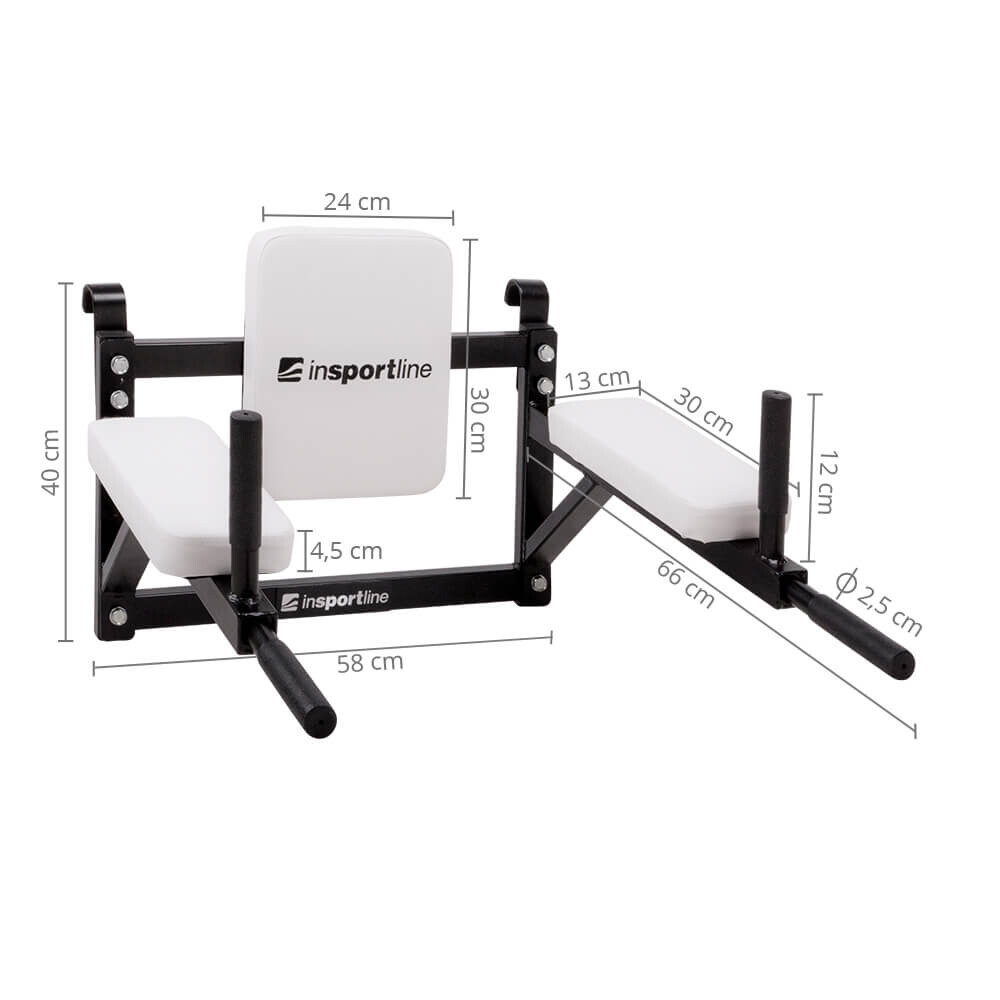 Seinale kinnitatav treenimispink (dip station) 2in1 inSPORTline LCR on mitmekülgne treeningvahend, mis sobib kasutamiseks nii varbseinal kui ka otse seinale kinnitatuna. Tänu kahele tugevale konksule saab selle hõlpsasti riputada varbseinale, samas kui komplektis olevad poldid võimaldavad kindlat paigaldust ka seinale.
